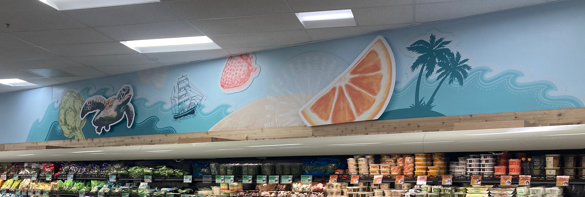 A 28 ft. mural for the beachside Trader Joe's in Isle of Palms, SC. I enjoy using 3D "pop-outs" to create depth and movement in murals.